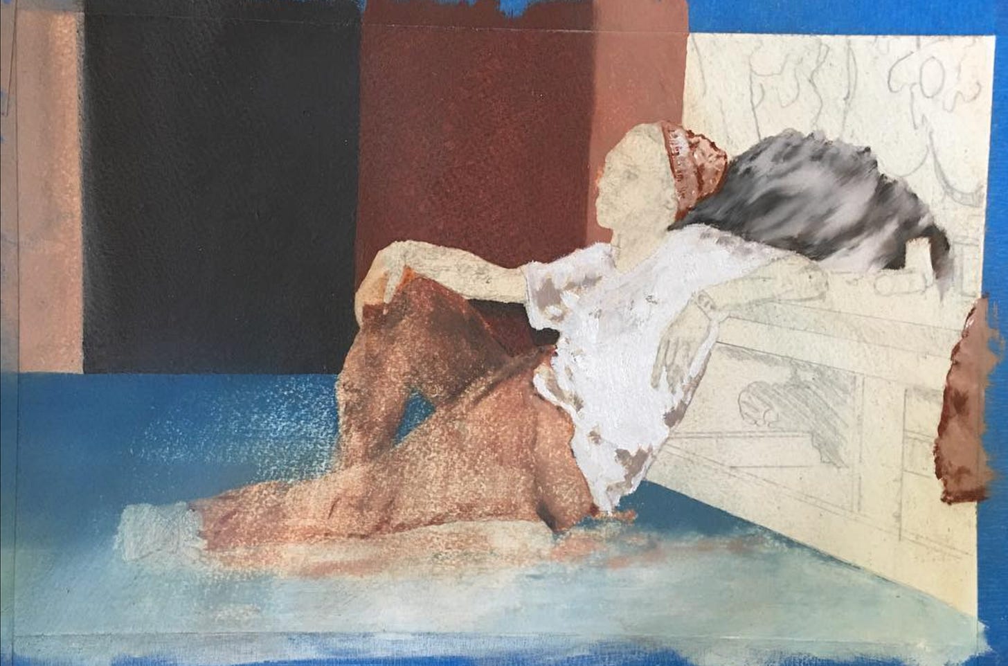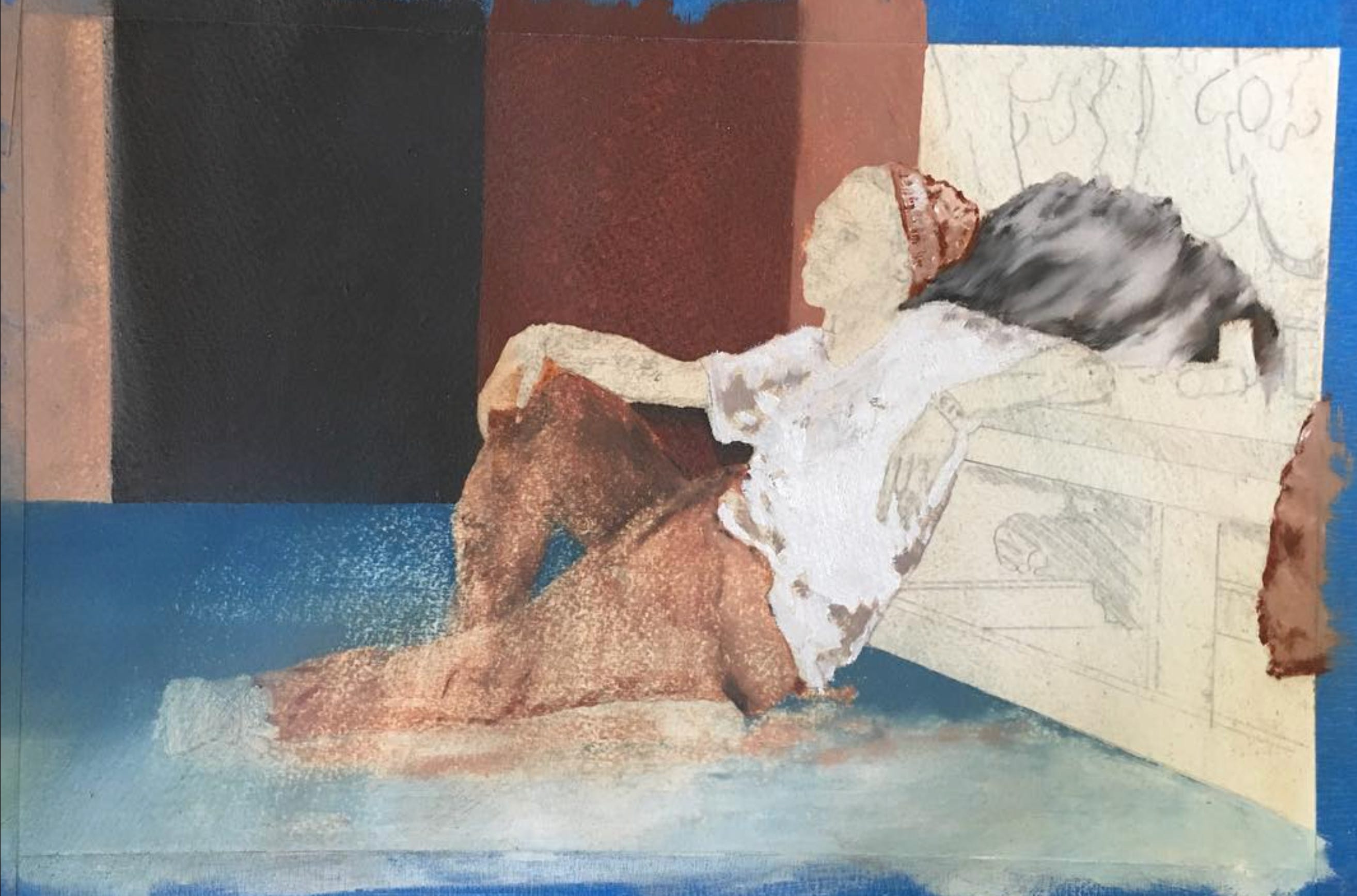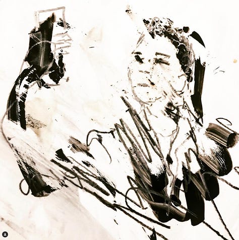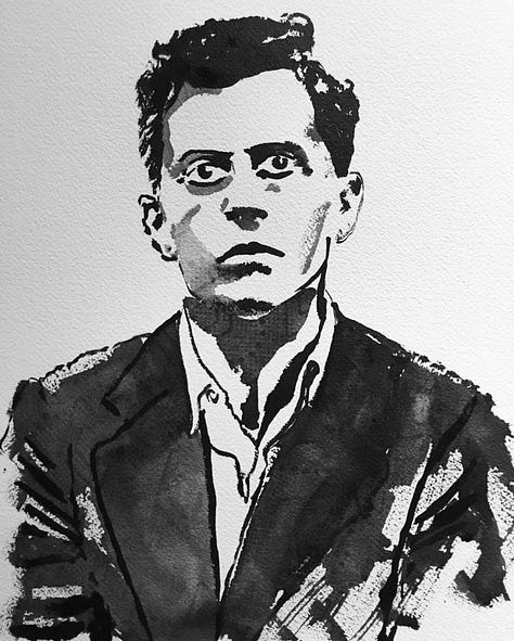Here is a drawing from a ballet I loved (but did not work on) that used phones on stage. It’s drawn with dry-erase marker and pencil. The dry-erase gives it a feeling like it’s being blown apart by heavy winds or scrubbed from existence by some unseen hand. Next a charcoal drawing of a wave… somehow the charcoal makes it feel more alive… like it’s moving. Last—a watercolor of Wittenstein and his “language is a game.” Surely he looks at the wave and shouts (in a little in-joke to himself) “Water!” But does he smile after his own joke? Or does he play it cool and dead-pan, never breaking character?