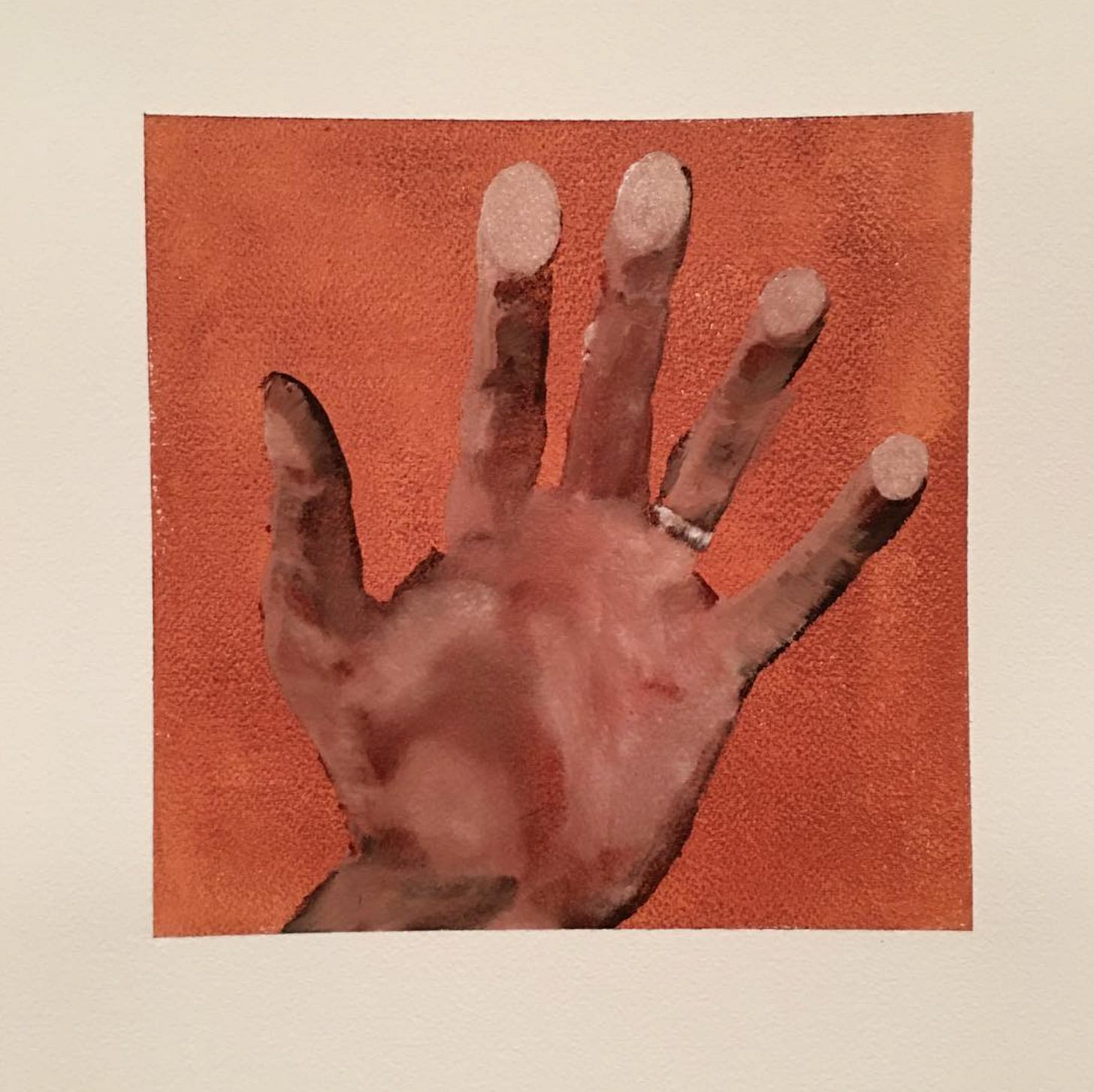 Here you see my hand touching the glass of the phone from the point of view of the phone. You can just detect my fingers pressing against the glass and going slightly pale as the pressure pushes the blood from my finger tips. This painting was done in a single sitting, so fast that it was all wet-on-wet. I wanted to capture a moment in time. There is something to this two-sided glass moment. Our phones know us. Our apps know us. And have opinions about us. Who, exactly, is in the zoo? Who is behind the glass?