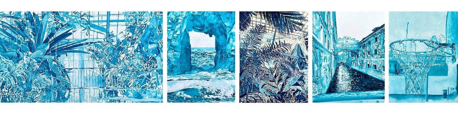 I started a new painting. And for the first time in a long time it is not ~only~ blue. I had very good reasons for the long stretch of blue paintings. My once blood-filled eye messed with my color perception, the long history of non-photo-blue in illustration, an urge for a recognizable & cohesive body of work… etc. As well as a very solid conceptual reason about how the single-hue opens the door to imagination. How we stop fighting the image and embrace the imaginative narrativity of it all.