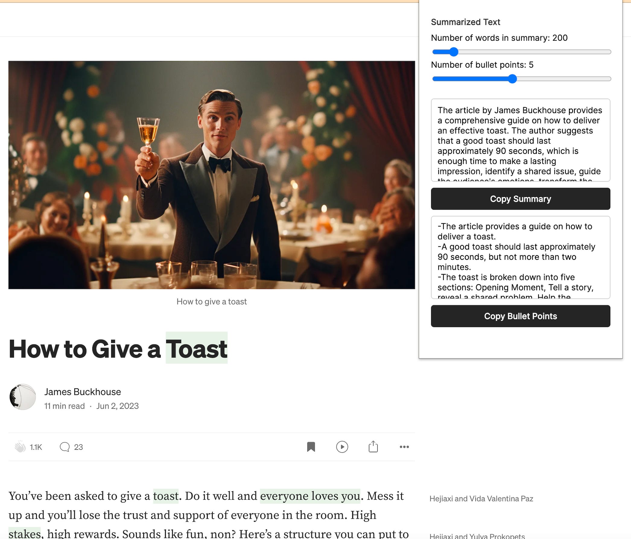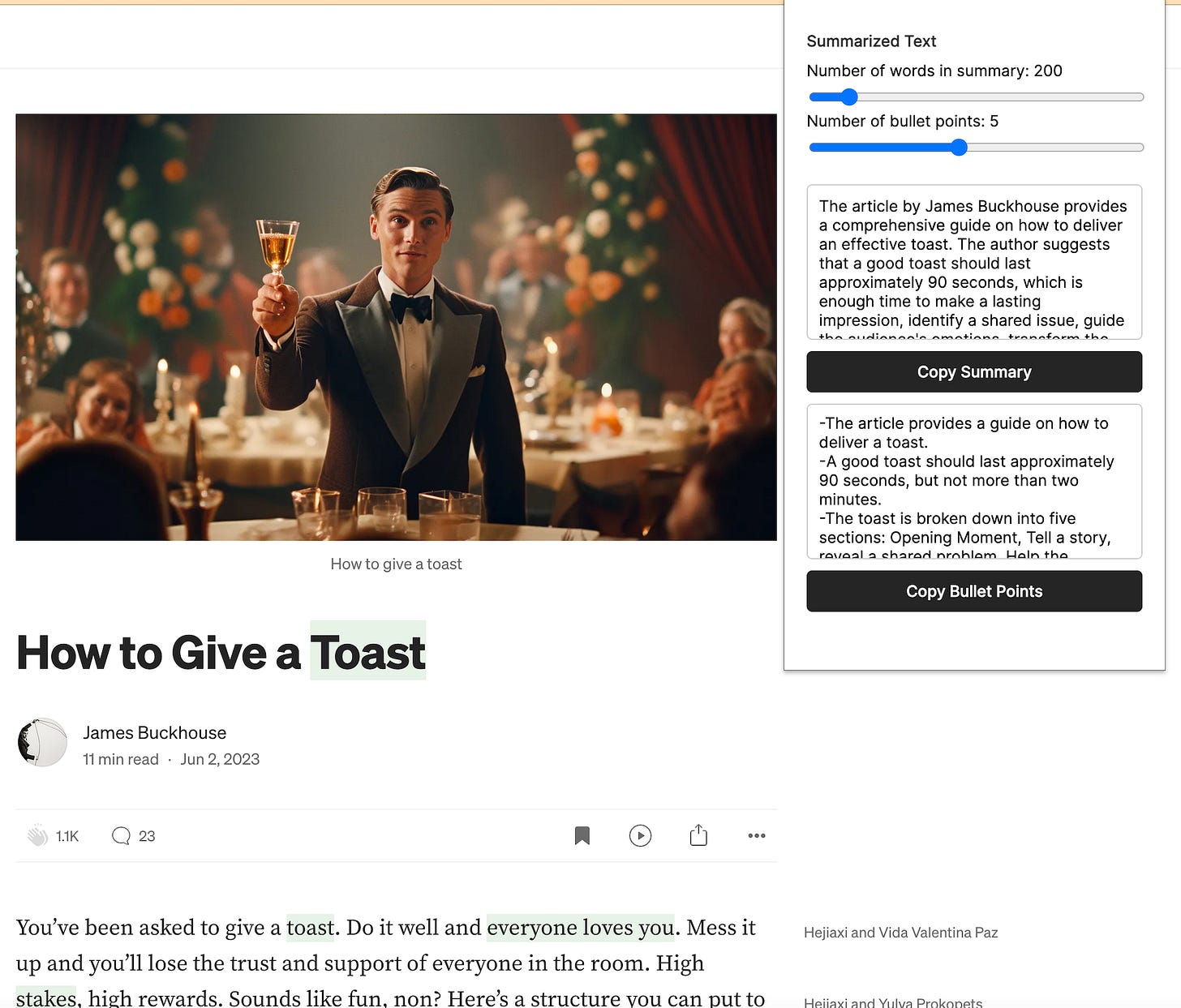 I created a Chrome Extension that pre-reads the webpage you’re on and then summarizes it. You can adjust the sliders to get a summary from 4-2000 words long. You can have 1-10 bullet points.https://twitter.com/buckhouse/status/1794847909781061809