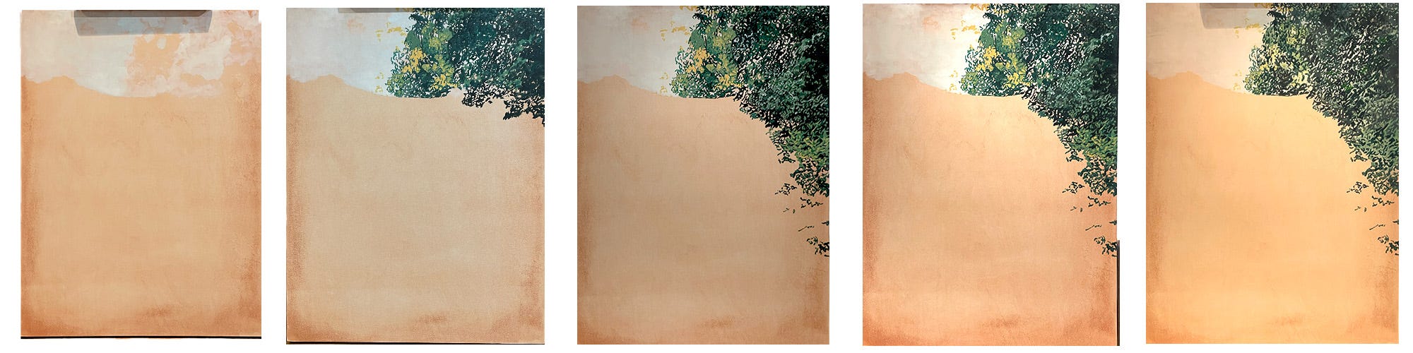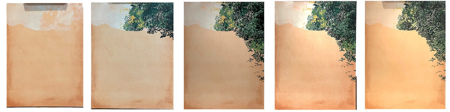 Painting foliage from a photograph of a place you’ve seen (and now try to remember) can trick you—are those yellow leaves? Or green leaves that look yellow when the bright light of the sun shines through them? Are those “light blue” sections reflected light on the top planes of the leaves or holes in the foliage where one can glimpse a punched-out puzzle piece of sky? Is it best to darken viridian with black or an opposing pigment (like say, red?) Do I want contrasting temperature undertones or complementary ones? Do I paint each leaf, like Andrew Wyeth’s fields of grass? or is it better to indicate or almost obscure? Blur? No Blur? How fat or thin the medium? Onward. More work ahead. I’m painting on wooden panel. Beautiful, flat, impossibly clean panels.