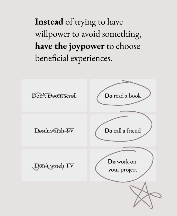 Joypower vs Willpower: Actively choose beneficial alternatives to detrimental experiences.