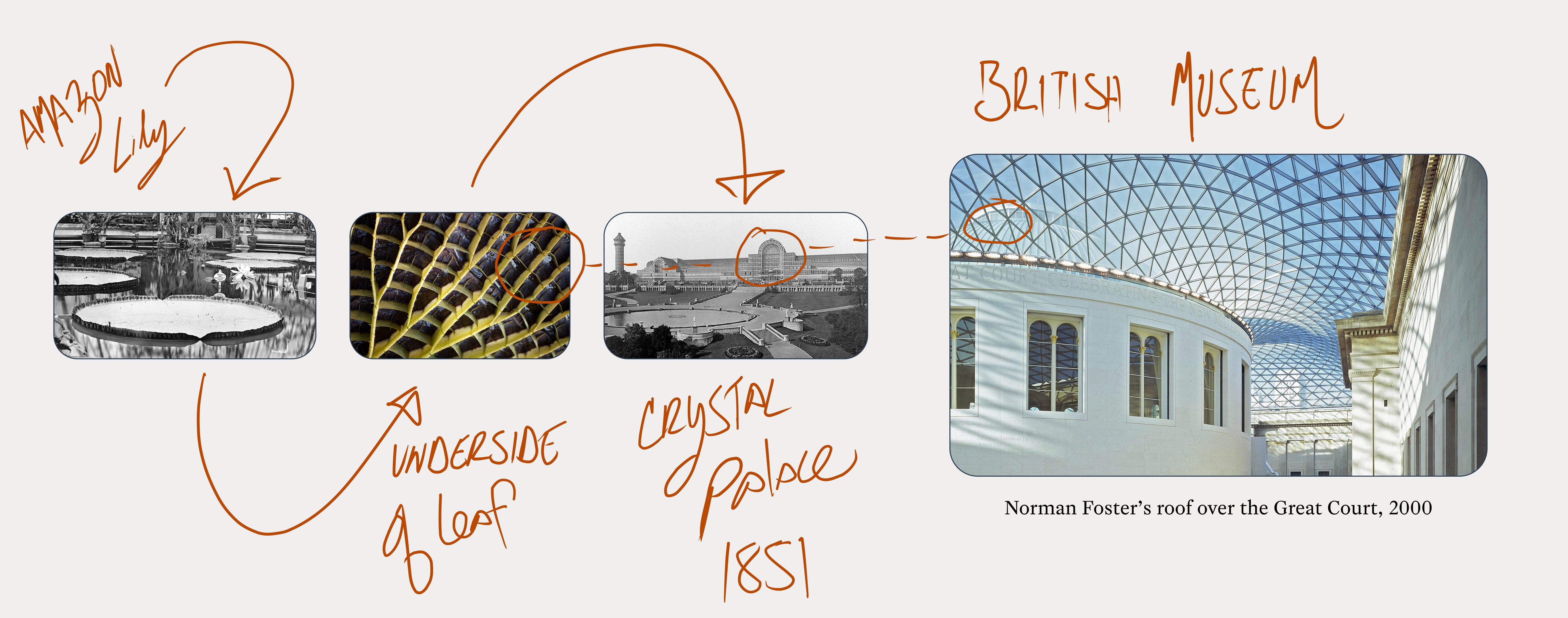 When the 1851 Exhibition was near, 250 designs were rejected for the project, then Paxton, who was not a trained architect, showed the underside of his giant lily leaf and explained that the solution to the problem had already been solved by nature.