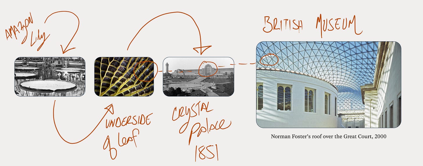 All we need to do is make panes of glass supported by steel frames, just like what he had done to build his green houses. The Crystal Palace was a hit, and astounded visitors and planted a new idea in the minds of architects everywhere—the pane and frame. In the 1990s, when Foster was doing his designs for adding a roof to the British Museum, he reached back through both the history of architecture and nature to modernize Paxton’s lily.