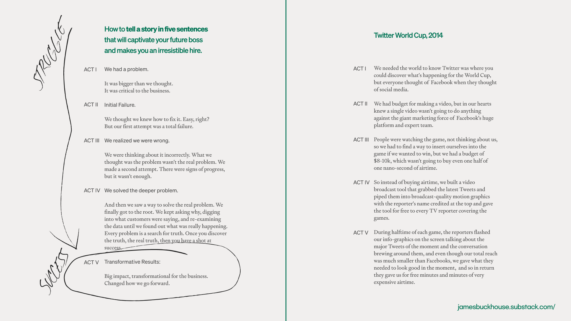 The first step is to turn each “act” into a single sentence adapted to the journey of shipping a project. Combine the five sentences to tell a story of what you learned (not just what you did) and how it transformed your understanding of the world, your career, and your entire workplace. This will create a story that has the interviewer rooting for you to win.
